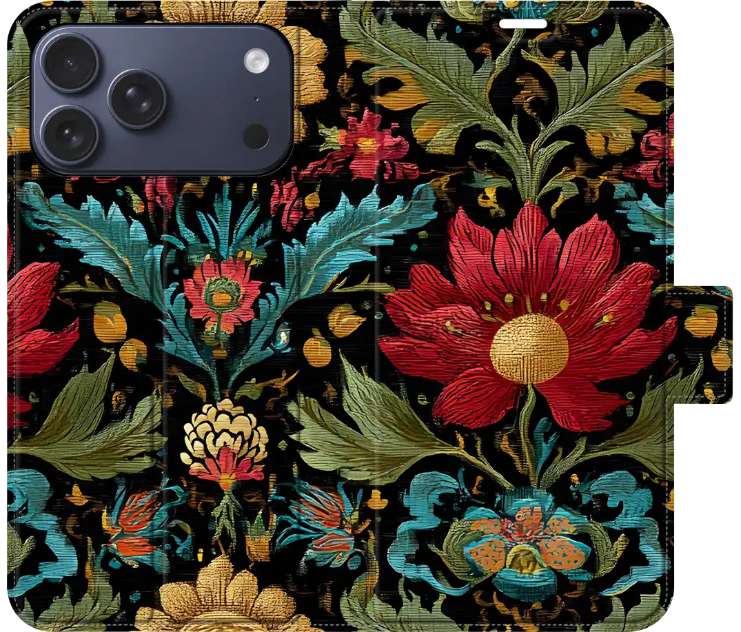 Elevate your phone's style with our faux leather folio wallet case, featuring an exquisite Medieval Brocade Tapestry effect inspired by the Art Nouveau works of William Morris. This case blends the elegance of Morris's intricate floral patterns with the convenience of modern phone protection, offering both beauty and practicality.