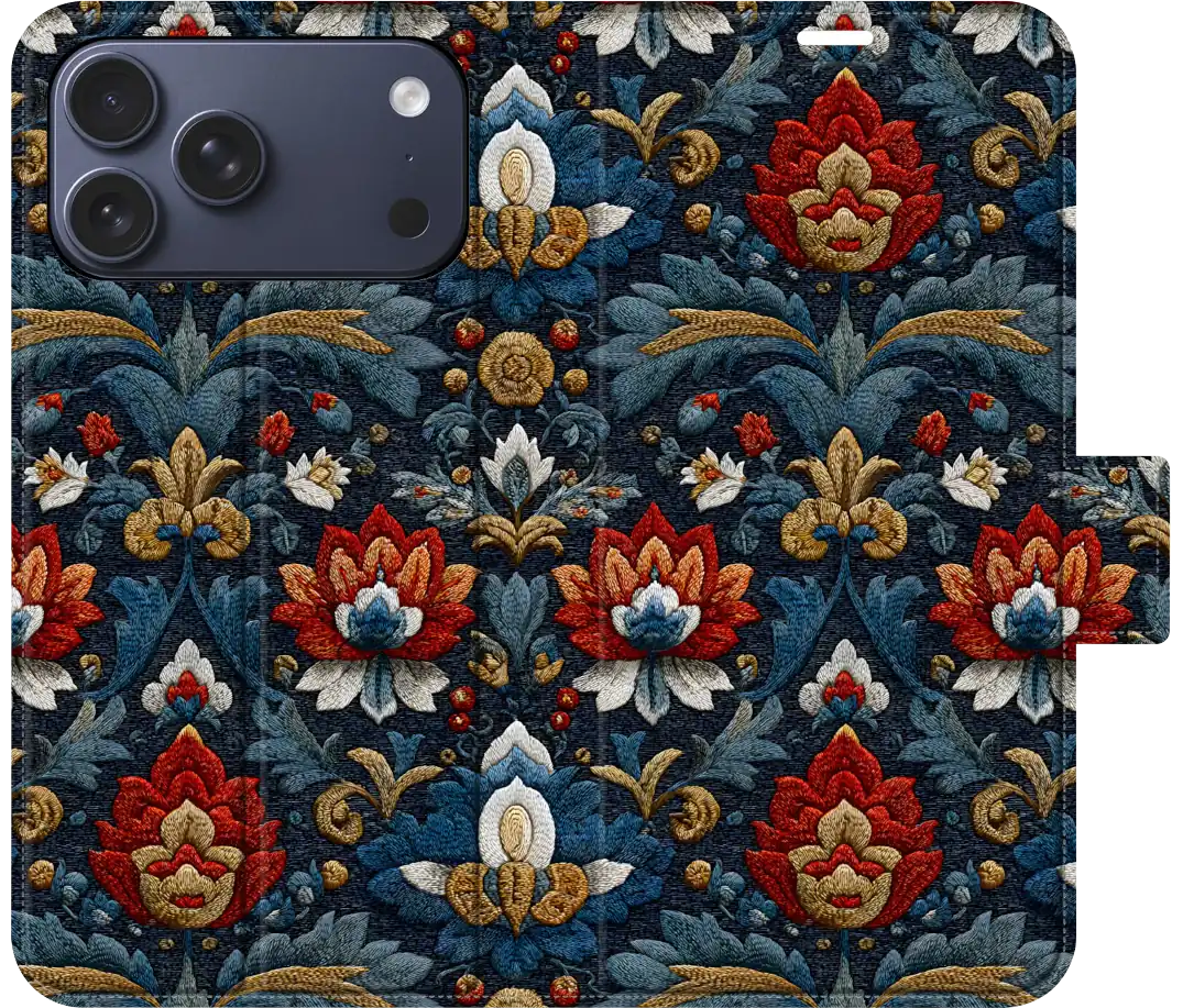 Elevate your phone's style with our faux leather folio wallet case, featuring an exquisite Medieval Brocade Tapestry effect inspired by the Art Nouveau works of William Morris. This case blends the elegance of Morris's intricate floral patterns with the convenience of modern phone protection, offering both beauty and practicality.